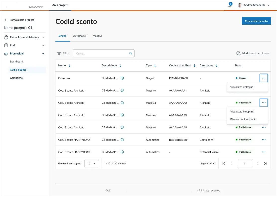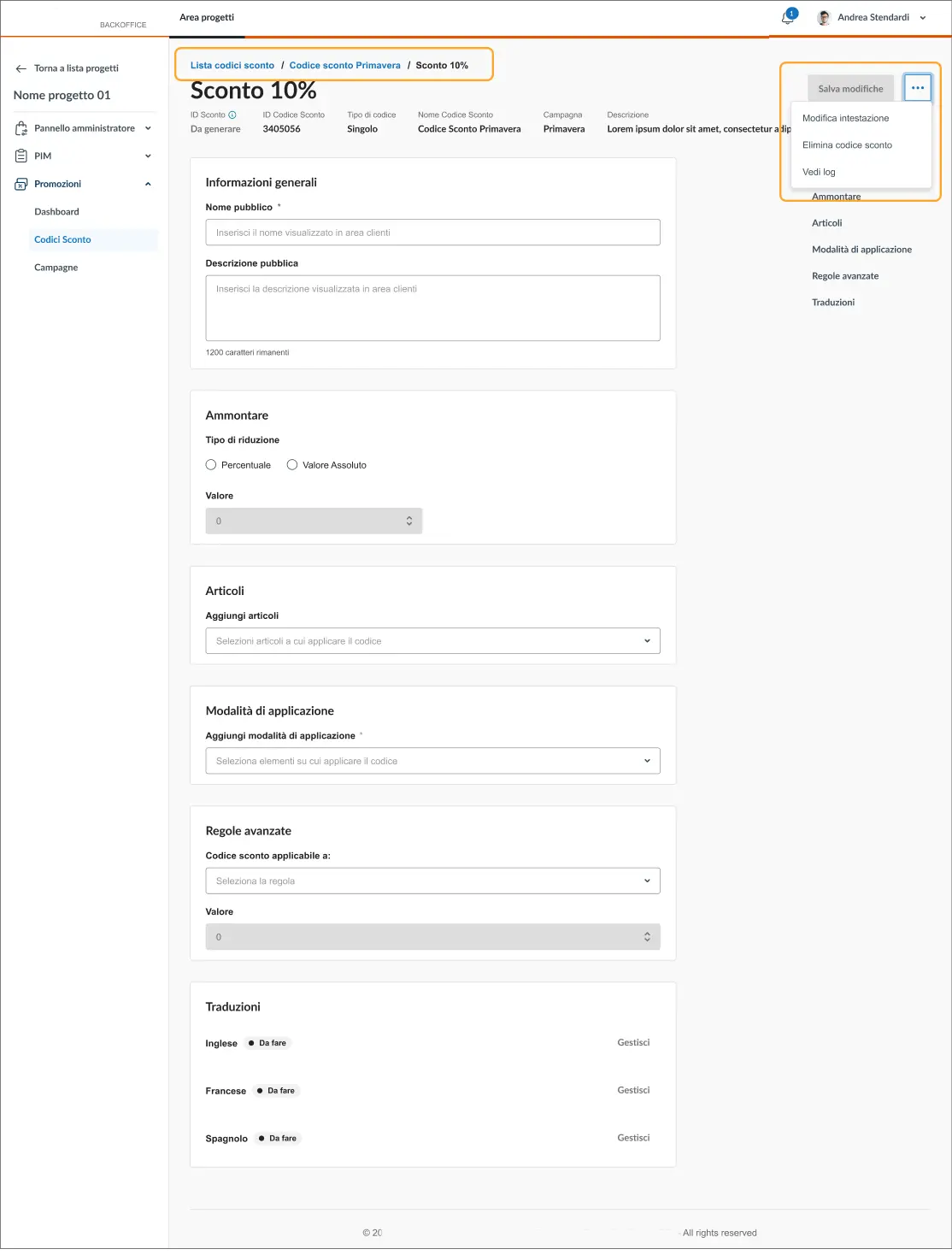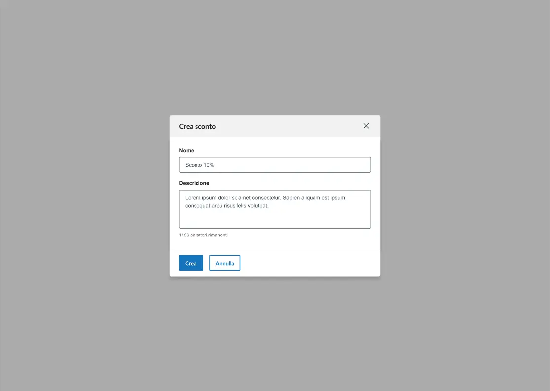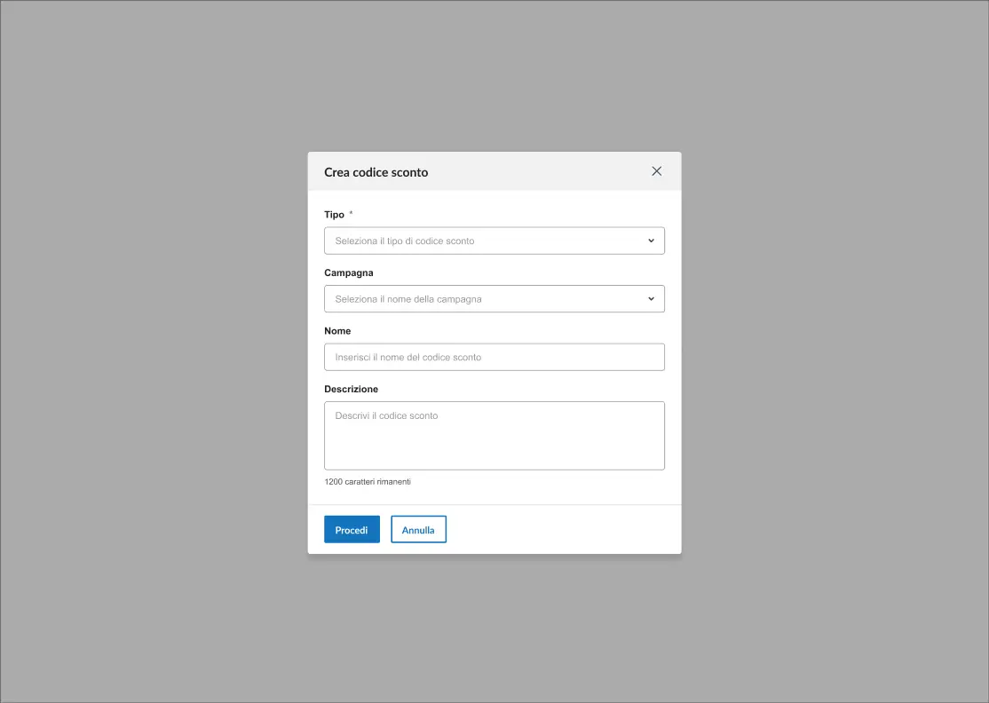 Discount Code Creation Modal: Pattern defined by the PIM workstream: creation always starts from a modal with essential parameters, then continues in the full configuration flow.