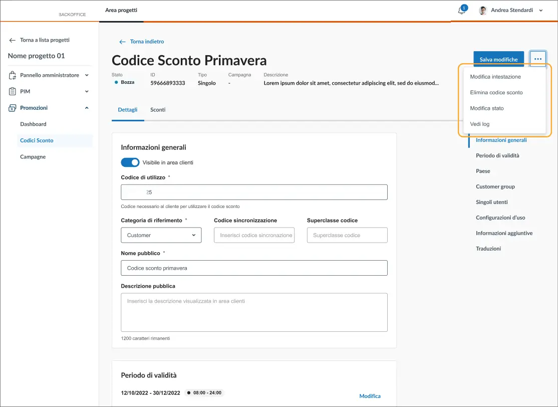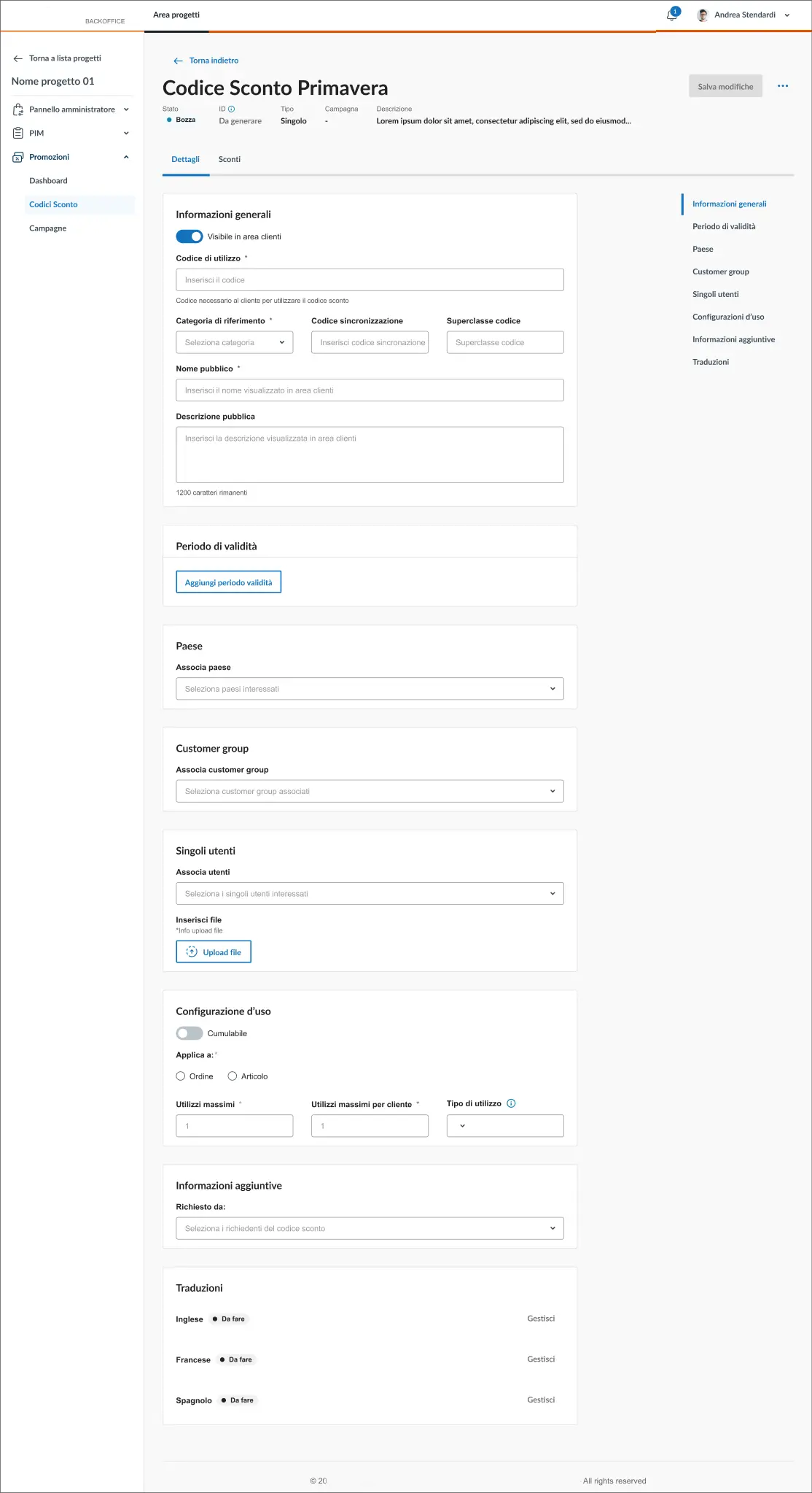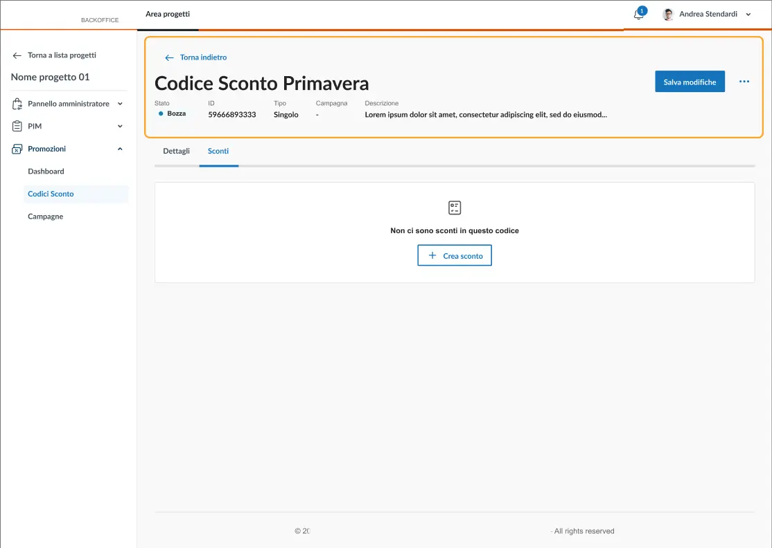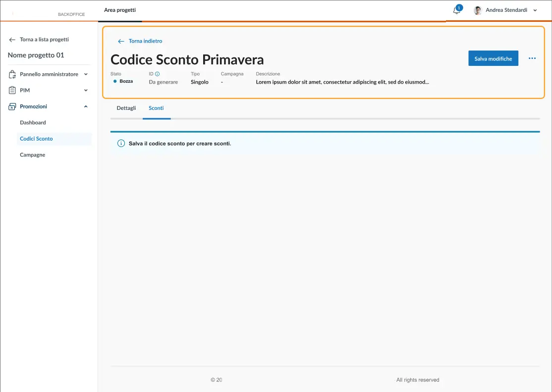 Discount Code Creation Modal: Pattern defined by the PIM workstream: creation always starts from a modal with essential parameters, then continues in the full configuration flow.
