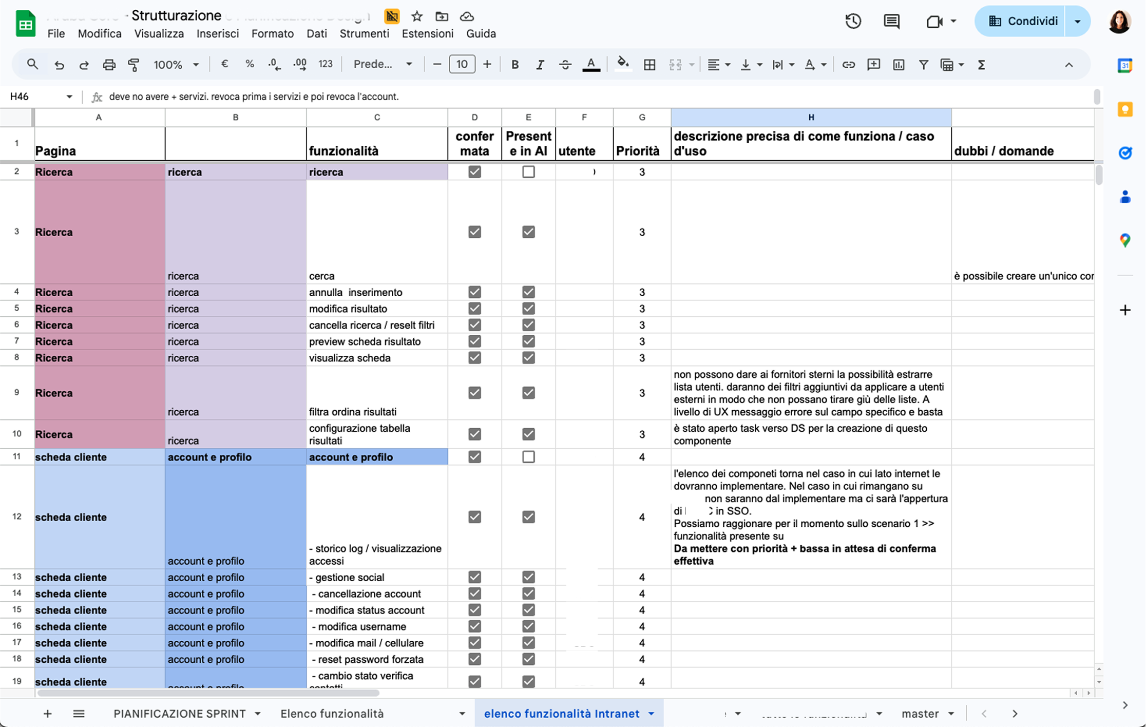 To make sense of it, we started organizing the documentation in Excel sheets, providing an initial section-based breakdown of the platform. This helped us clarify functionalities, identify priorities, and create a shared foundation for the next steps.